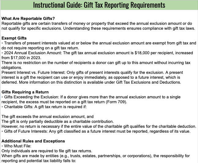 - Determining Reportable Gifts: Understand what qualifies as reportable and how to manage gifts exceeding the annual exclusion.