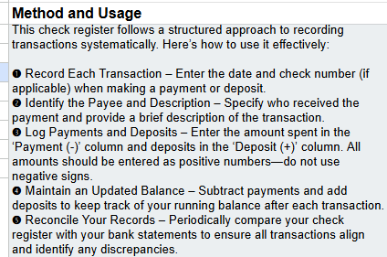 The template includes all the essential fields—Date, Check Number, Payee, Description, Payment (-), Deposit (+), and Balance—and is pre-formatted with auto-calculating formulas. Just enter your transactions and the balance updates instantly. It also features a space to input your starting balance, so you can customize it to your bank account immediately.