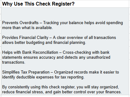 Take control of your finances with this professionally designed Simple Check Register Spreadsheet, compatible with both Excel and Google Sheets. Whether you’re managing personal spending, tracking small business cash flow, or simply replacing your paper checkbook, this digital register gives you an intuitive way to stay organized.