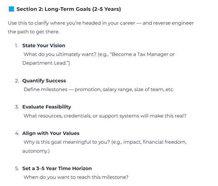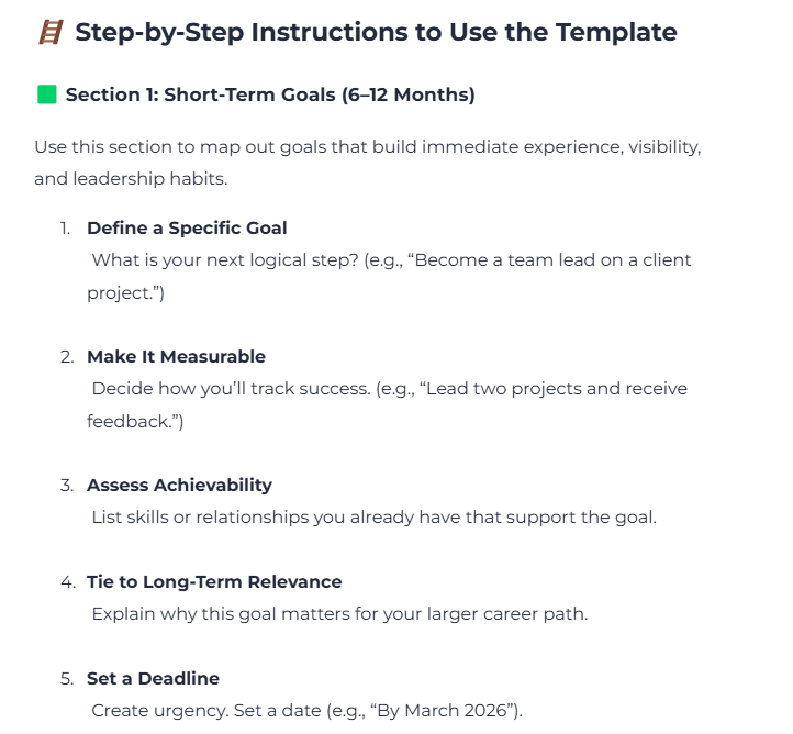 Whether you’re preparing for a promotion, building a leadership portfolio, or transitioning into management, this tool will help you stay focused, motivated, and on track. It’s perfect for annual reviews, mentoring sessions, or independent career planning.