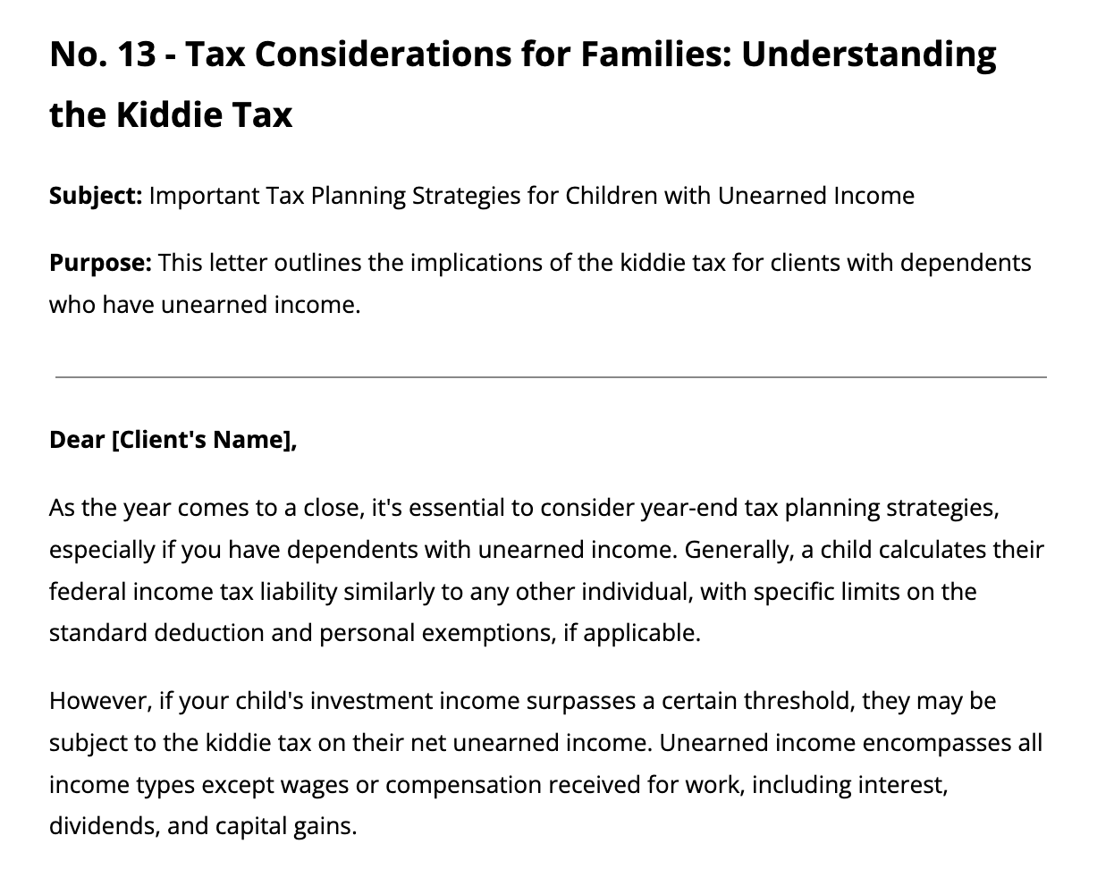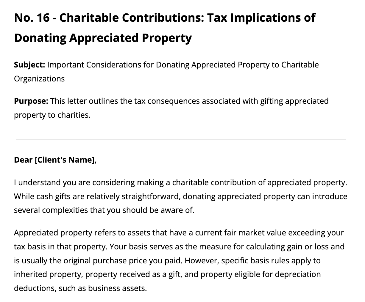 In an ever-evolving financial landscape, proactive communication is crucial. Our templates cover vital topics such as gifts of appreciated property, kiddie tax implications, property transfers between spouses, and charitable giving strategies. By providing your clients with clear, actionable insights, you position your firm as a trusted advisor, empowering them to make informed decisions and optimize their financial strategies.