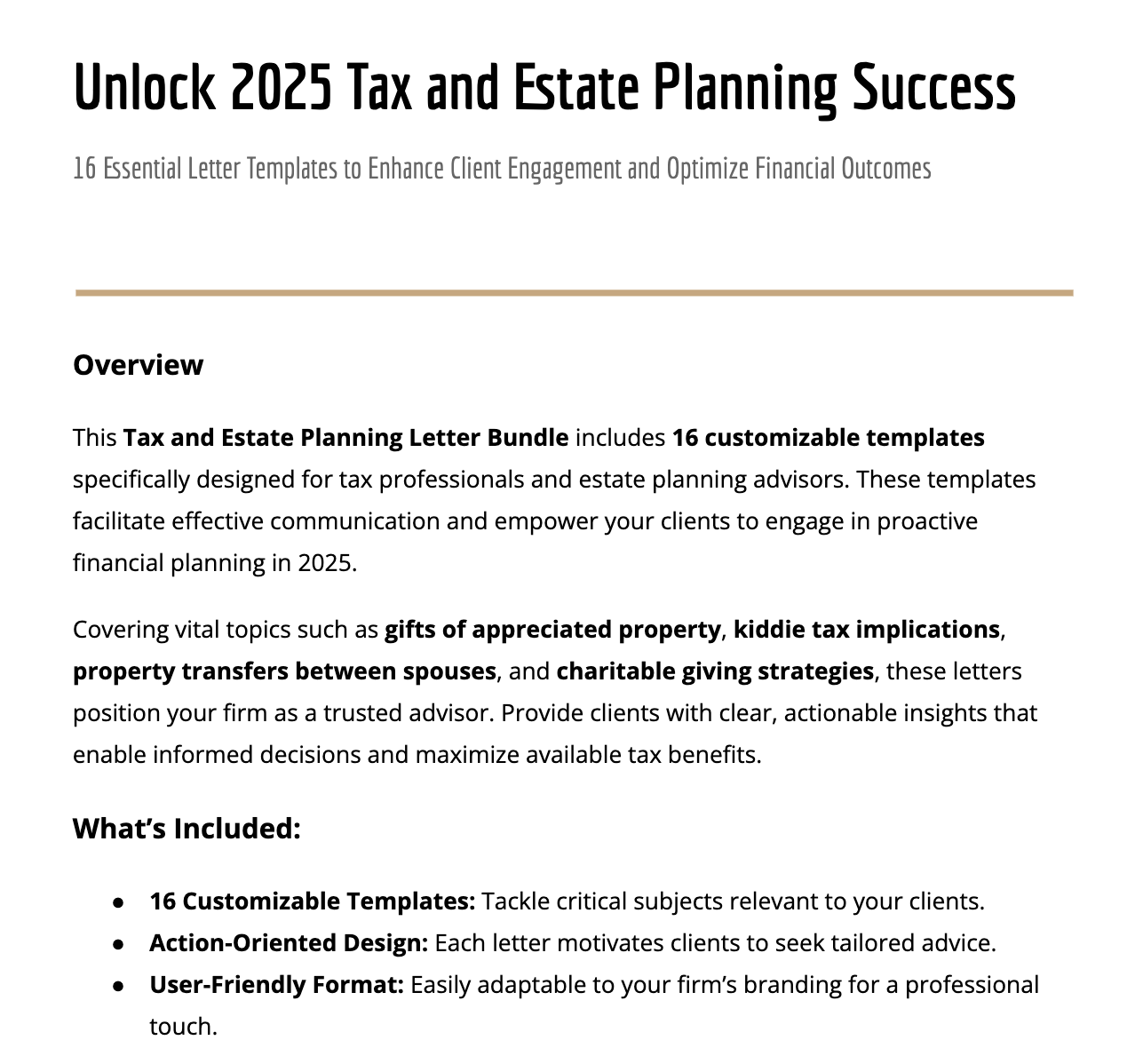 Why Choose This Bundle? With the 2025 Tax and Estate Planning Letter Bundle, you can strengthen client relationships, increase engagement, and secure future business for your firm. Leverage these templates to keep clients informed and help them maximize their tax benefits throughout the year.